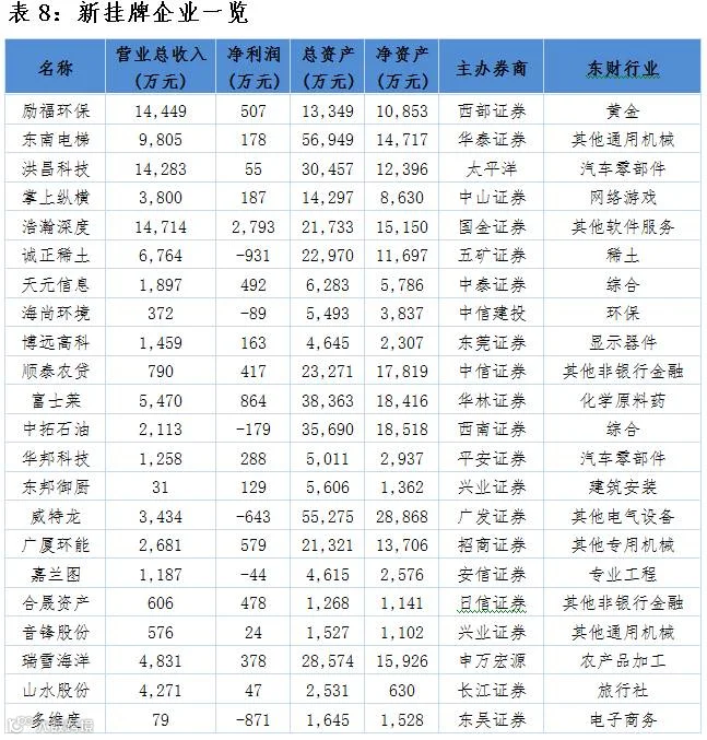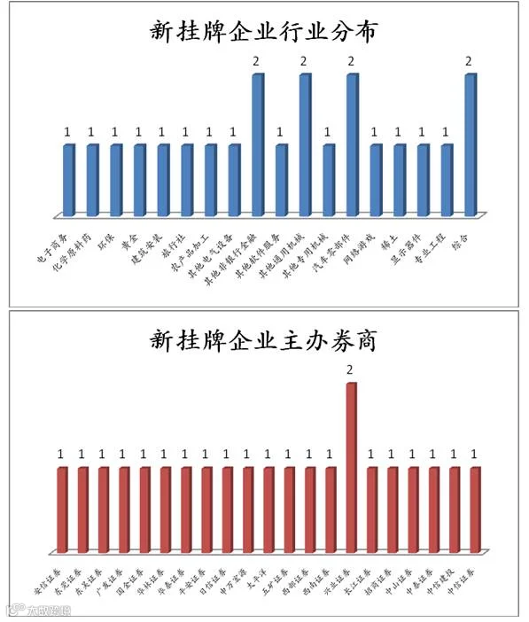 点评:当日新增22家公司,均为协议转让。新挂牌企业行业中,其他非银行金融、其他通用机械与汽车零部件行业占比较大。主办券商方面兴业证券占比较大。