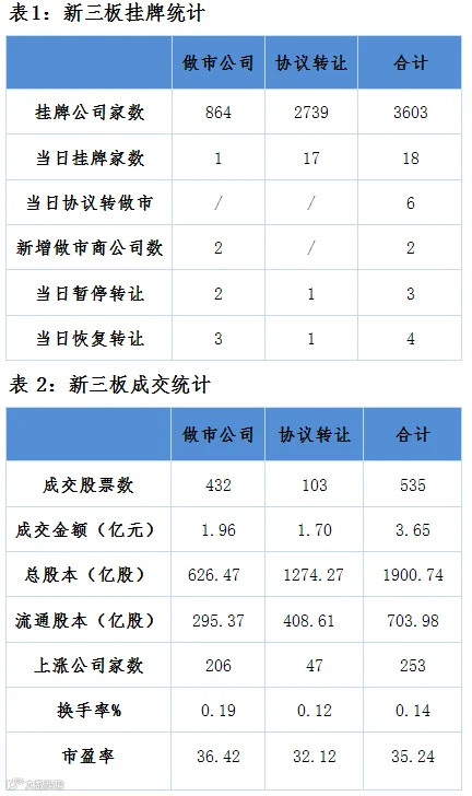 昨日新三板报535只个股参与交易,其中253只个股上涨。成交额3.65亿元,其中做市公司成交1.96亿、协议转让公司成交1.70亿。