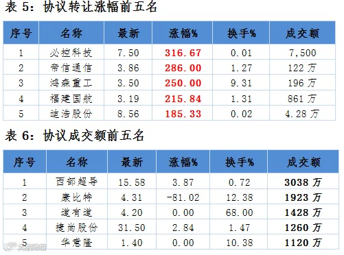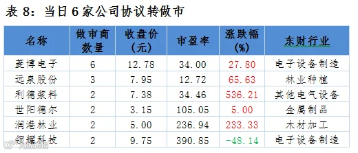 点评:6家协议转做市企业中,5家上涨,1家下跌。利德浆料协议转做市企业首日涨幅居做市公司首位,涨幅536.21%。