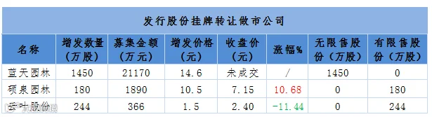 表12、昨日16家公司新增发行股份并挂牌转让:3家做市公司、10家协议转让公司分别为伟乐科技、蓝天精化、风格信息、拓新股份、德安环保、天准科技、新马精密、传视影视、上元堂、聚阳环保。