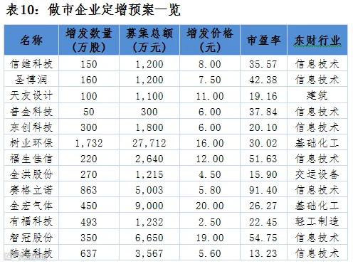 点评:40家公司共募集52亿元,定增企业行业分布中信息技术行业占比较大,募集资金最大的为亚锦科技募集资金26.4亿元。