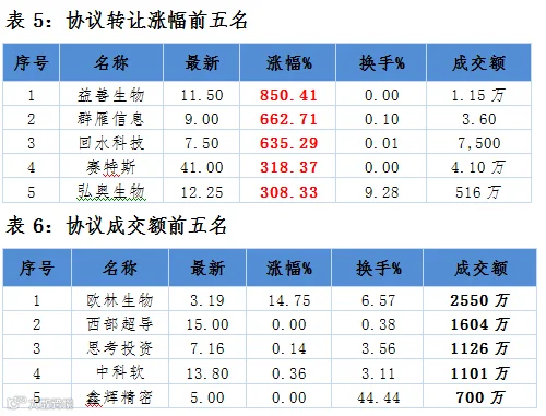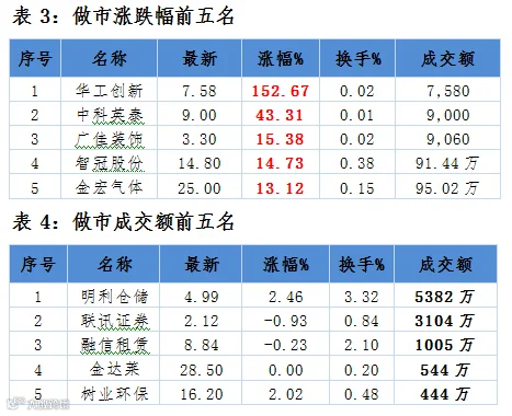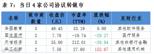 点评:4家协议转做市企业中,1家上涨,2家下跌,一家无涨跌幅。华工创新协议转做市企业首日涨幅居做市公司首位,涨幅152.67%。
