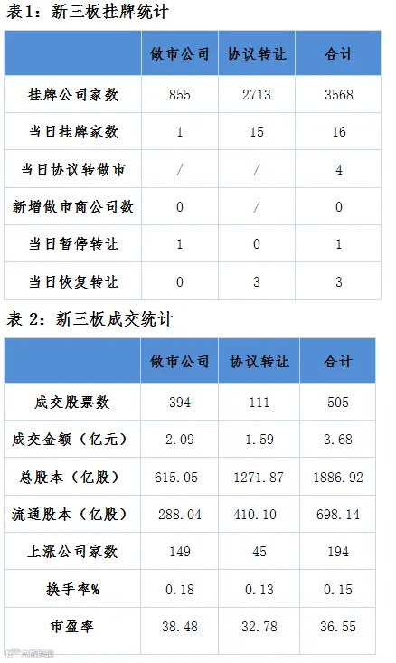 昨日新三板报505只个股参与交易,其中194只个股上涨。成交额回落至3.68亿元,其中做市公司成交2.09亿、协议转让公司成交1.59亿。