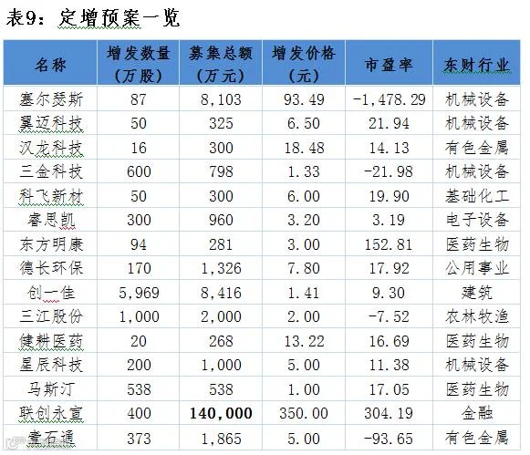 点评:15家公司共募集16.65亿元,定增企业行业分布中机械设备行业占比较大,募集资金最大的为联创永宣合计14亿元。