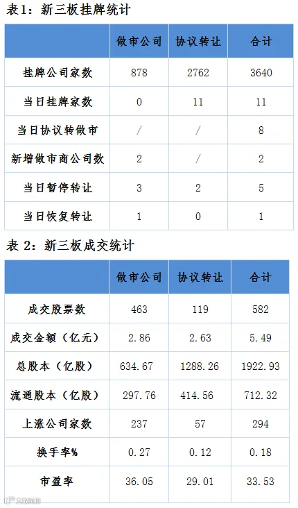 昨日新三板报582只个股参与交易,其中294只个股上涨。成交额较昨日有所萎靡,报5.49亿元。其中做市公司成交2.86亿、协议转让公司成交2.63亿。
