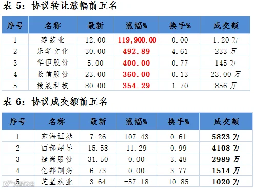 涨跌幅方面,仅7只股票涨幅超过100%,其中建装业涨幅119900%位居涨幅榜首位。乐华文化和华恒股份随其后,涨幅分别为492.89%、400.00%。相比之下,数聚股份、皓月股份和安达科技则跌幅居前分别为99.00%、81.52%和68.72%。