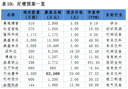 点评:12家公司共募集11亿元,定增企业行业分布中食品饮料行业占比较大,募集资金最大的为天地壹号募集资金6.25亿元。