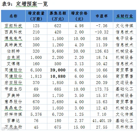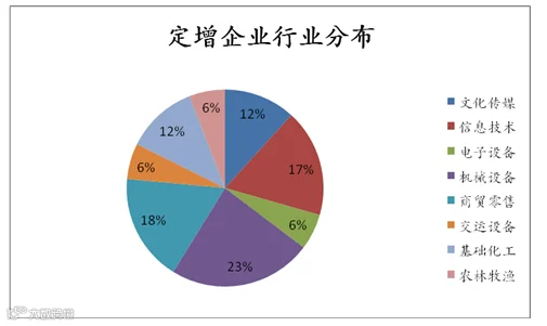 点评:17家公司共募集8.16亿元,定增企业行业分布中机械设备行业占比较大,募集资金最大的为同健股份合计4.99亿元。