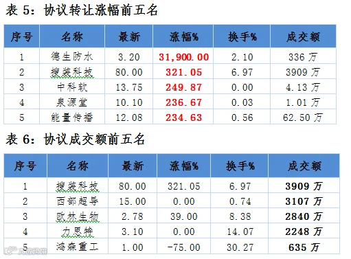 涨跌幅方面,7只股票涨幅超过100%,排名前三位的分别是德生防水、搜装科技和中科软,涨幅分别问31900%、321.05%和249.87%。相比之下,ST奥贝克、益善生物和鸿森重工则跌幅居前分别为99.50%、90.69%和75.00%。