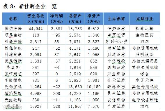 点评:当日新增13家公司。新挂牌企业行业中,其他专用机械行业占比较大。主办券商方面分布比较广泛。