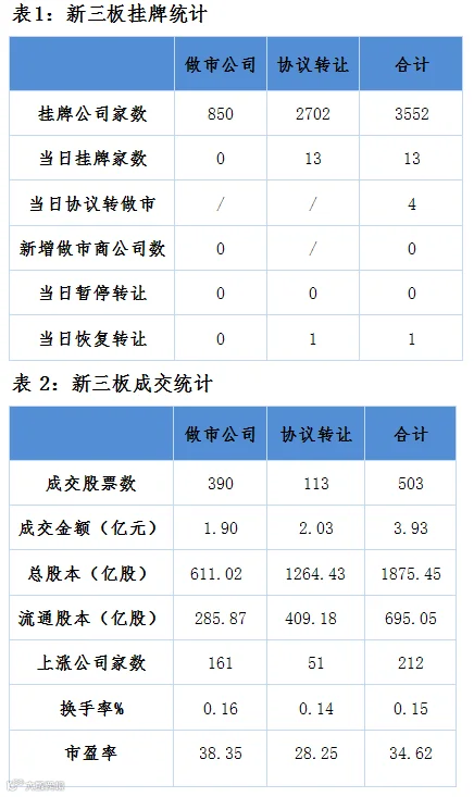昨日新三板报503只个股参与交易,其中212只个股上涨。成交额小幅回升至3.93亿元,其中做市公司成交1.90亿、协议转让公司成交2.03亿。