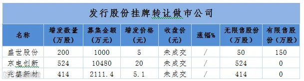 表10、昨日13家公司新增发行股份并挂牌转让:3家做市公司、10家协议转让公司分别为财安金融、光大灵曦、北方嘉科、嘉智信诺、尚慧能源、永邦科技、合全药业、丽明股份、鸿益达、西部超导。