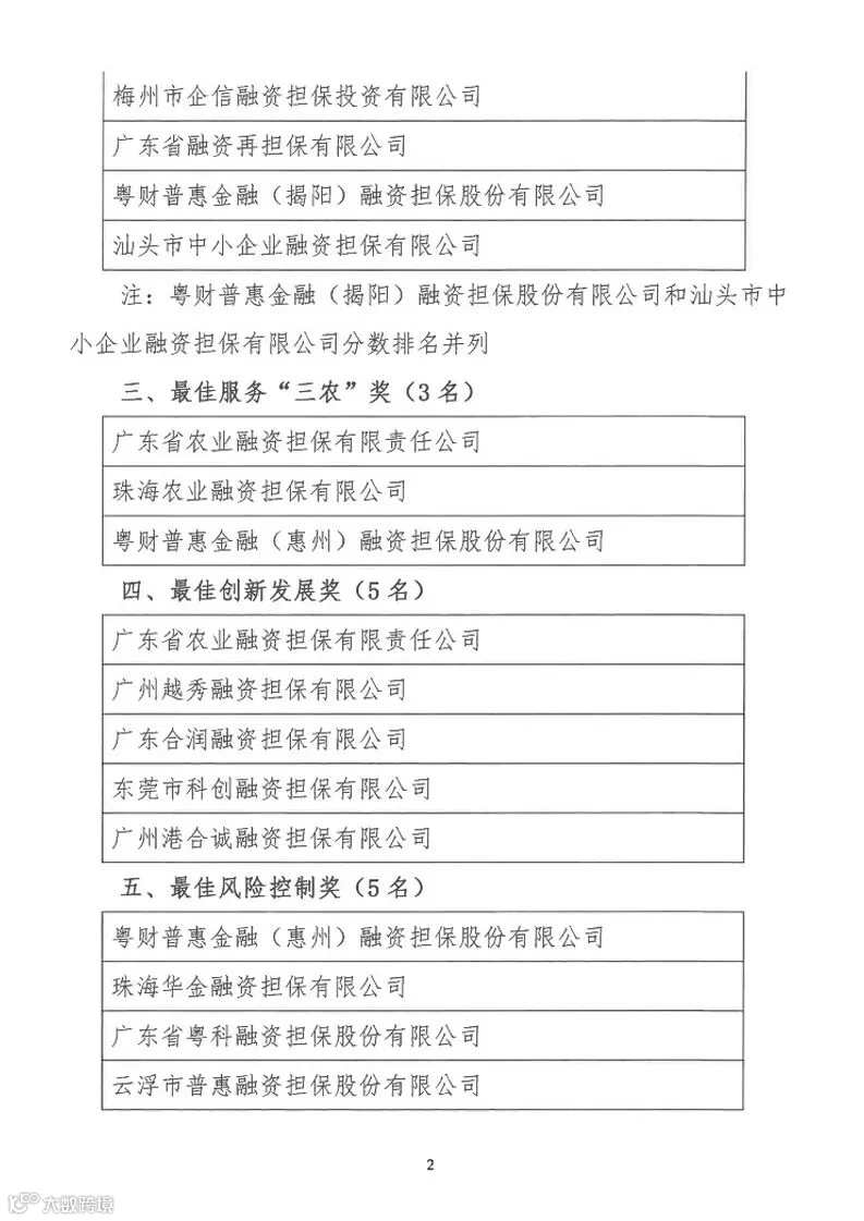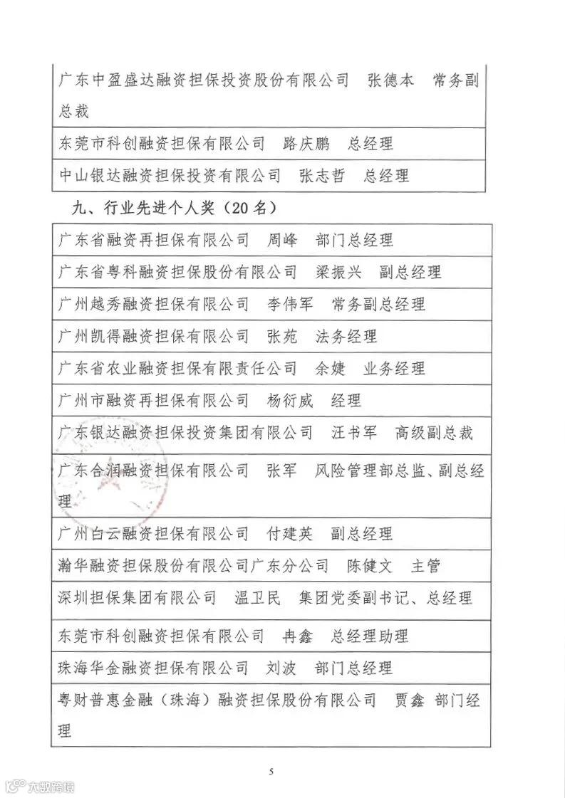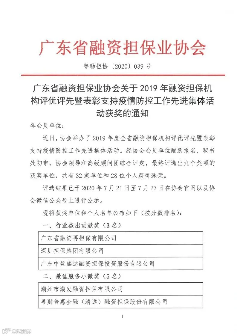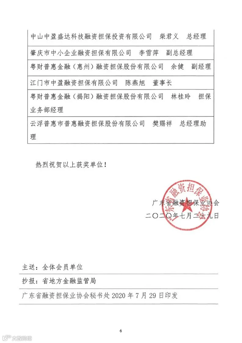 在本次评选活动中,经全省协会会员单位踊跃报名、秘书处初审、协会领导和高级顾问团综合评定,最终评出了九个奖项的获奖单位,共有32家单位和28位个人获得殊荣。作为全省融资担保行业上市龙头企业,广东中盈盛达融资担保投资股份有限公司以及其分、子公司凭借优异的业绩表现及行业贡献获得其中6项殊荣。其中,广东中盈盛达融资担保投资股份有限公司获得“行业杰出贡献奖”和“疫情防控工作先进集体奖”,子公司云浮普惠融资担保股份有限公司获得“最佳风险控制奖”,子公司中山中盈盛达科技融资担保投资有限公司获得“优秀会员单位奖”, 广东中盈盛达融资担保投资股份有限公司常务副总裁张德本获得“行业领军人物奖”, 中山中盈盛达科技融资担保投资有限公司总经理柴君义、云浮普惠融资担保股份有限公司总经理助理樊赐祥获得“行业先进个人奖”。