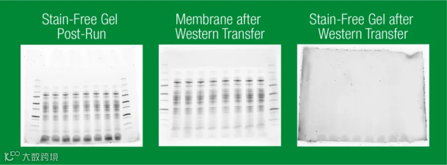 免染技术有助于故障排除,更快地发现问题。您可在跑胶后立即看到总蛋白(左)。转印后,对膜(中间)和凝胶(右)进行成像,以确保蛋白质已完全从凝胶转移到膜上。