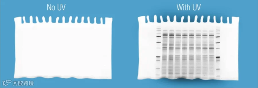 将免染凝胶在成像仪中紫外激活,从而无需染色、脱色即可实现总蛋白的可视化。