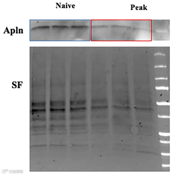 Stain-Free免染总蛋白归一化后获得的Apelin-13定量结果显示。多发性硬化症高峰阶段Apelin-13的表达量显著下调。