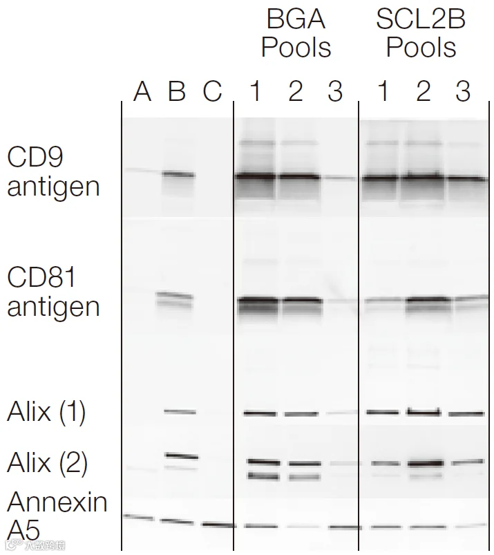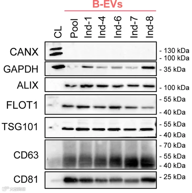 在细胞外囊泡EV,特别是外泌体的WB鉴定实验中,我们通常需要同时检测多个蛋白的相关Marker。在“MISEV2018”中EV的蛋白Marker表征建议做到“三阳一阴”,即:至少三种阳性蛋白标记,包括至少一种跨膜/脂质结合蛋白,一种胞质蛋白;至少一种阴性蛋白标记。有兴趣详细了解MISEV2018指导原则的朋友可以自行查阅文献(doi: 10.1080/20013078.2018.1535750)。