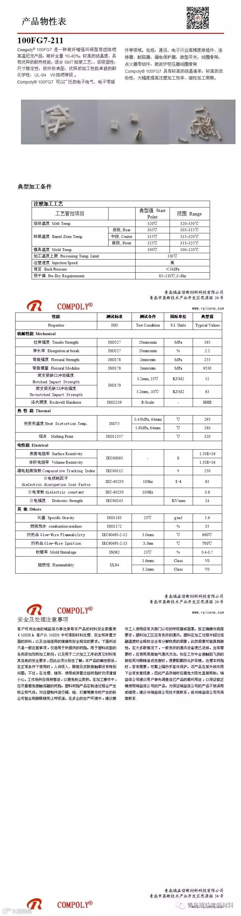 青岛瑞益信新材料Compoly® 100FG7 是一种玻纤增强环保型有卤阻燃高温尼龙产品,玻纤含量10-40%;较高的结晶度,具有优异的耐热性能,适合SMT贴装工艺,,低吸湿性,尺寸稳定性,良好的表面,优异的加工性能卓越的耐化学性,UL-94 V0阻燃等级,。
