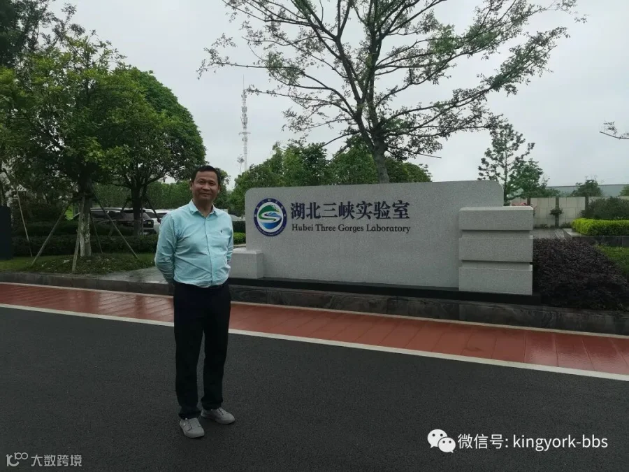 胡红兵在三峡实验室牌子前留影。三峡实验室首席科学家池汝安教授就是母校武汉工程大学教授。