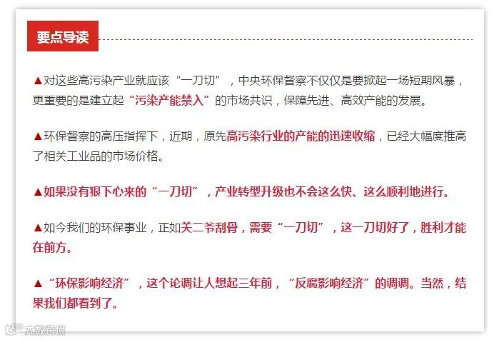 中央各媒体集中发声,关注点主要集中在整治“散乱污”、去除多余产能、倒逼产业升级、良币驱除劣币。从上面的资料来看,以前的唯GDP为重的大方向已经变化,环境问题也逐渐成为了加分项。环保督察真的不是在走过场、绕圈圈,而是在真的动真格。风来了,除了面对,无处可躲。