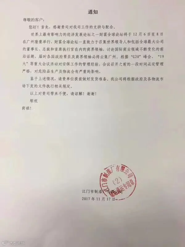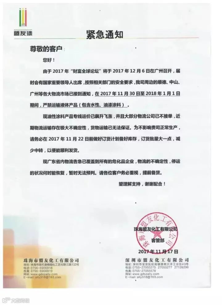 截至发稿,珠海盟友化工、江门制漆等化工企业均接到各地相关政府部门的通知,针对下游用户发布紧急通知。广东是我国涂料之乡,此次禁运将严重影响到涂料、原材料产品的运输,将会对华南地区的涂料企业发展产生很大的影响。