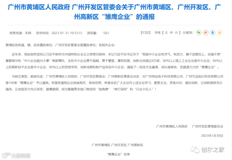 2023年1月31日,广州市黄埔区人民政府在其官网发布《广州市黄埔区人民政府 广州开发区管委会关于广州市黄埔区、广州开发区、广州高新区“雏鹰企业”的通报》(以下简称“通报”),通报公示了区内100家“雏鹰企业”名单,我司在名单行列。