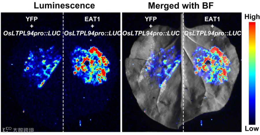实验中,将效应子和报告子通过农杆菌介导的浸润共转化到烟草叶表皮细胞中,或通过聚乙二醇介导的转化共转化到水稻原生质体中,将稀释的 d-荧光素钾盐 (1 mM) 涂抹在烟叶表面,使用ChemiDoc成像系统进行发光及明场图片的拍摄。