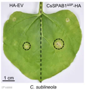 从LUC成像实验结果可以明显看出:与空载对照相比,CsSPAB1ΔSP能够显著激活SbBsr-d1启动子,从而导致LUC表达水平显著提高。这是一个CsSPAB1ΔSP(ΔSP表示信号肽被删除的CsSPAB1)与SbBsr-d1启动子相互作用实验,SbBsr-d1是高粱(Sorghum bicolor)中Bsr-d1基因的同源基因。实验中,SbBsr-d1启动子与LUC报告基因融合,形成报告构建物(SbBsr-d1:LUC)。当这个报告构建物与CsSPAB1ΔSP共转化到烟草叶片中时,CsSPAB1ΔSP能够显著激活SbBsr-d1启动子,导致LUC表达水平显著提高。