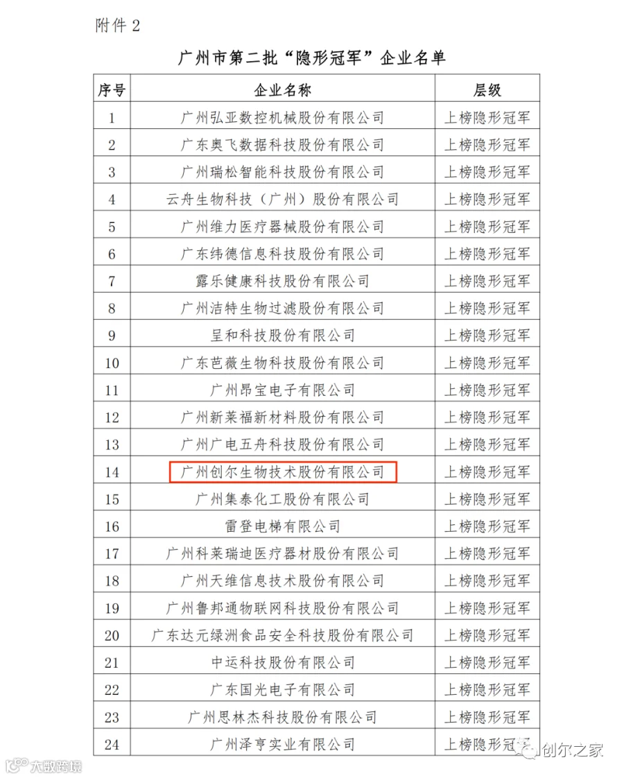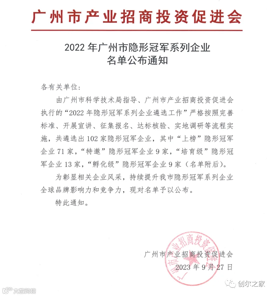 2023年9月29日,广州市产业招商投资促进会在其“广州市产促会 广州市楼促会”官方微信号中公开了“2022年广州市隐形冠军系列企业名单”的公告(以下简称公告)。