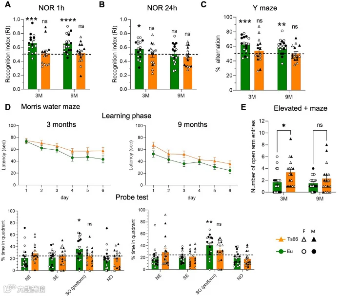 1. 首先对 Ts66Yah 小鼠进行行为学分析,表明随着年龄的增长,小鼠认知能力出现障碍并伴随行为异常改变。