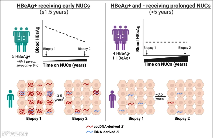 转录来源的悄然转变:随着 NUCs 治疗时间的延长,HBsAg 的转录来源从 cccDNA 逐渐转向 iDNA,早期治疗组的这一转变尤为显著。