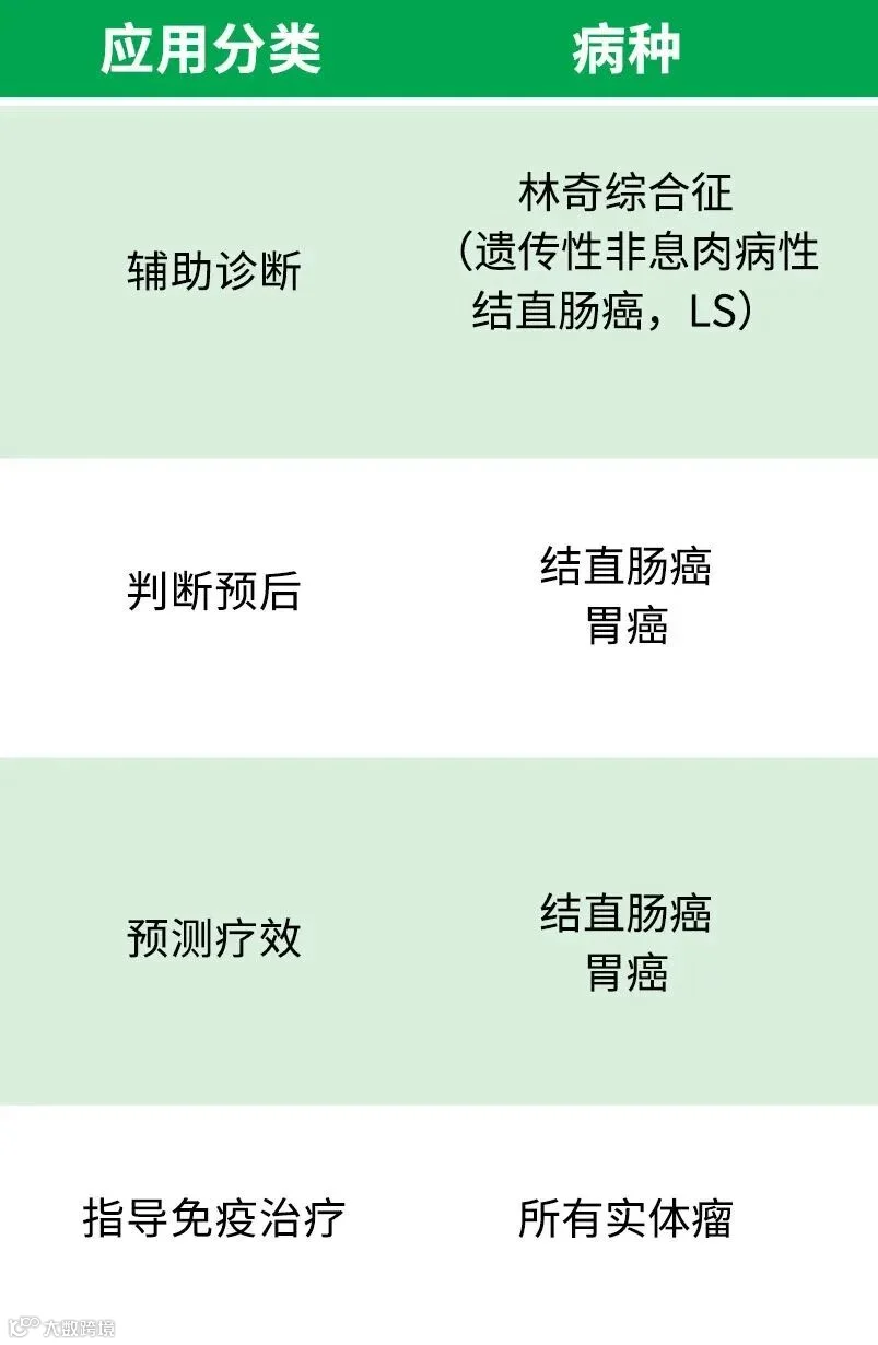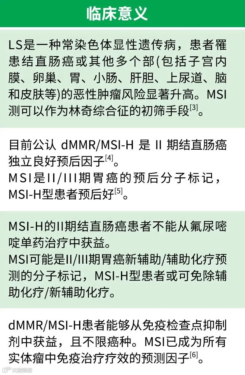MSI/MMR 对于多种肿瘤的诊断、预后判断以及治疗选择具有重要意义。