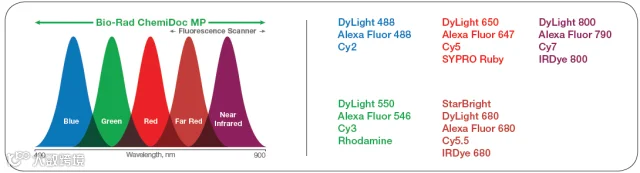 Bio-Rad公司推出了一款具有红外荧光成像功能的ChemiDoc™ MP全能型成像系统,该系统除具备原有CD Touch系统的高灵敏度化学发光成像功能外,还特别配置了五色荧光通道(RGB+2IR)可兼容市场上常见的荧光染料,令您的WB成像更加得心应手。红外荧光染料具有更低的荧光背景及更高的灵敏度,是WB荧光成像的最佳选择。ChemiDoc™ MP可使用DyLight800、IRDye800、IRDye700、Cy7等常用的红外染料,研究者设置不需要更换实验条件的,就可以轻松的将其他系统上的荧光成像工作转移到该系统上来。