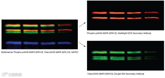 在以往的WB成像实验中,化学发光与荧光就如“鱼与熊掌”一般难以兼得。多色荧光具有优异的动态范围和定量线性,但是往往因为灵敏度不及化学发光而被诟病;化学发光具有优异的灵敏度,但是信号容易饱和、背景不均一。Bio-Rad新款ChemiDoc™ MP将两种Blot成像方法完美整合,缔造出优异的灵敏度与定量准确度。多色荧光功能让研究者可以不用Stripping和Reprobing就可以轻松的研究磷酸化蛋白等重要的信号转导过程,或涉及到多个蛋白的复杂调节过程。