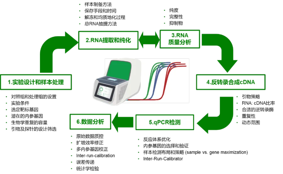 令人期待的是,Bio-Rad 公司一直在大力提倡和遵循 MIQE 指南的原则和理论,并发展出一套符合 MIQE 指南的 RT-PCR/qPCR 全流程实验方法,涵盖从实验设计到数据分析等 6 大实验环节。