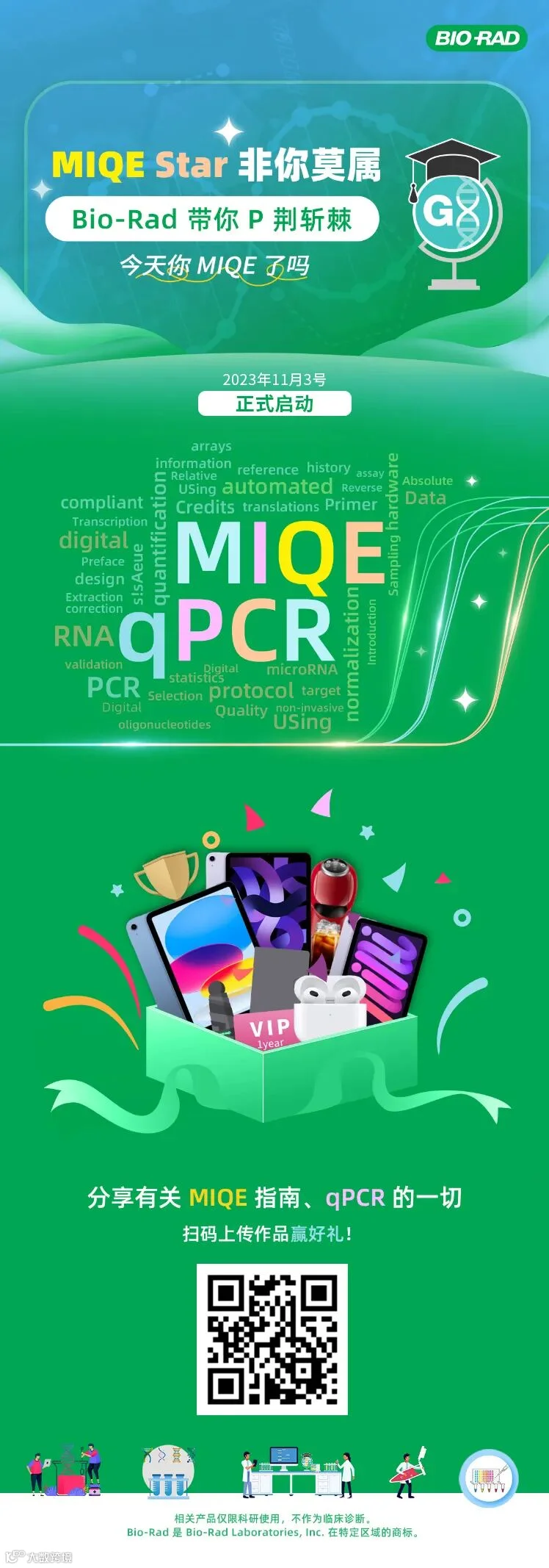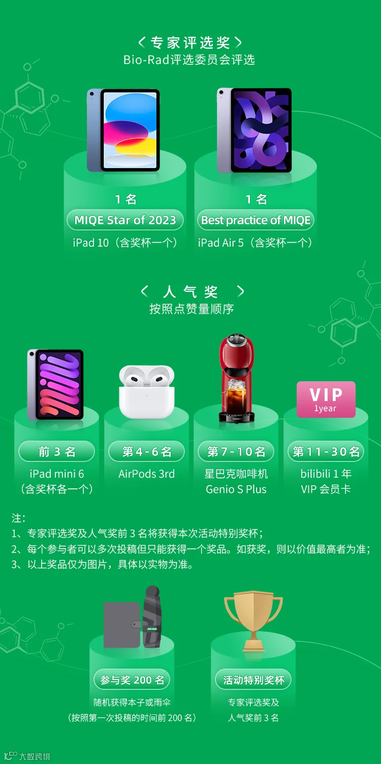 ●MIQE Star of 2023:学习 MIQE 指南后的感受和体会;深入解读+评论 MIQE 周边相关的论述;补充 MIQE 指南尚未详细论述的内容等等,详情请查阅投稿模板;此奖项由 Bio-Rad 内部评审委员会对每一个作品打分产生,分数排名第一名获得 iPad 10 奖品(含奖杯一个);