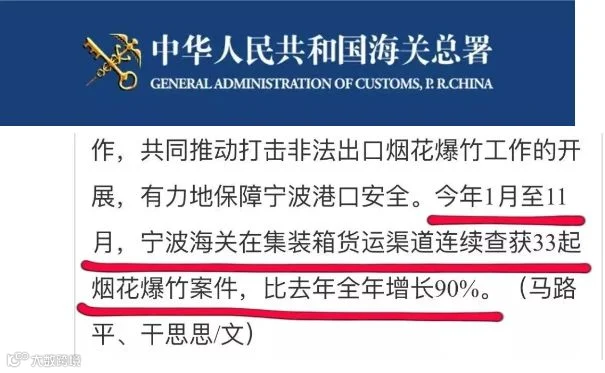据了解,海关总署官网今年公开的宁波港烟花爆竹瞒报案已居各大口岸之首,在百度上也能搜索到N条关于“宁波海关烟花爆竹”的相关资讯报道......烟花爆竹属于易燃易爆危险品,以夹藏、伪报等方式违规出口烟花爆竹,缺乏相应的安全措施,容易导致爆炸等严重后果,给社会安全、港口作业和货物运输带来巨大安全隐患。今年以来,宁波海关严格落实有关批示要求,积极开展非法出口烟花爆竹专项整治行动,精心部署落实,提升风险研判,创新监管手段,并加强与地方公安部门和市交通局的合作,共同推动打击非法出口烟花爆竹工作的开展,有力地保障宁波港口安全。