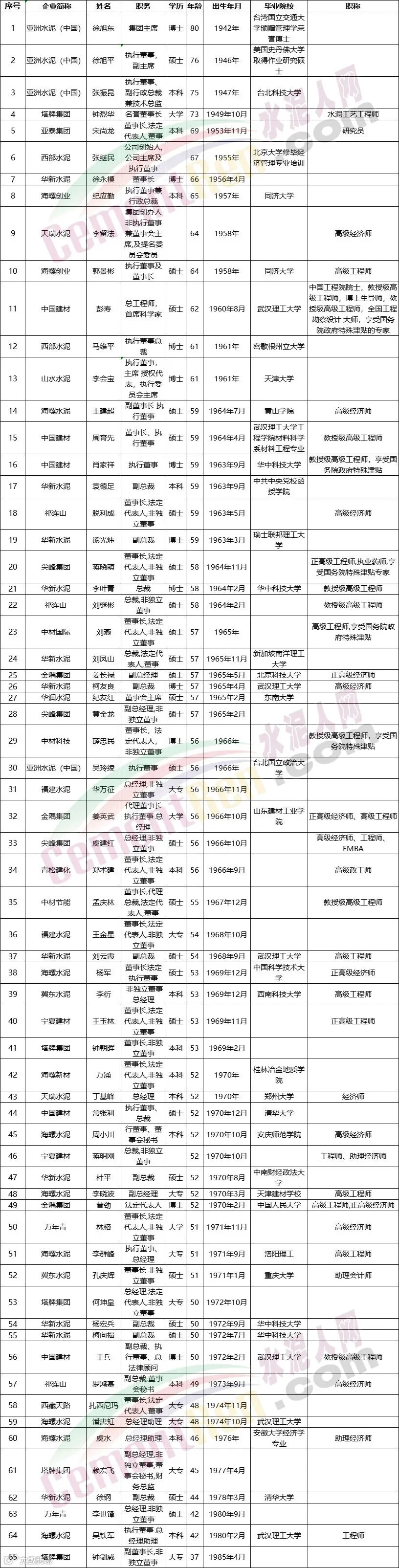 中材国际刘燕;华新水泥刘凤山、柯友良;金隅集团姜长禄;华润水泥纪友红;尖峰集团黄金龙同为1965年生人,均为57岁;