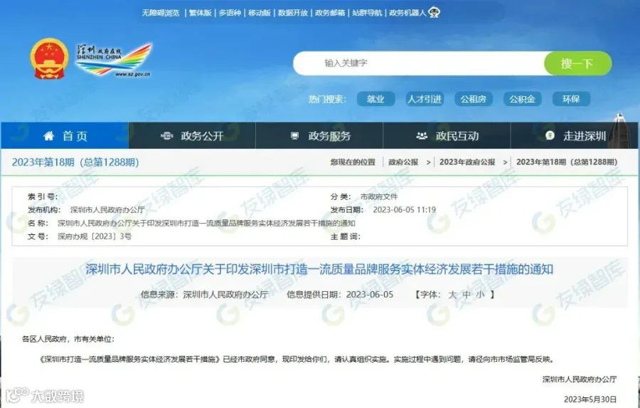 政策名称:《深圳市打造一流质量品牌服务实体经济发展若干措施》