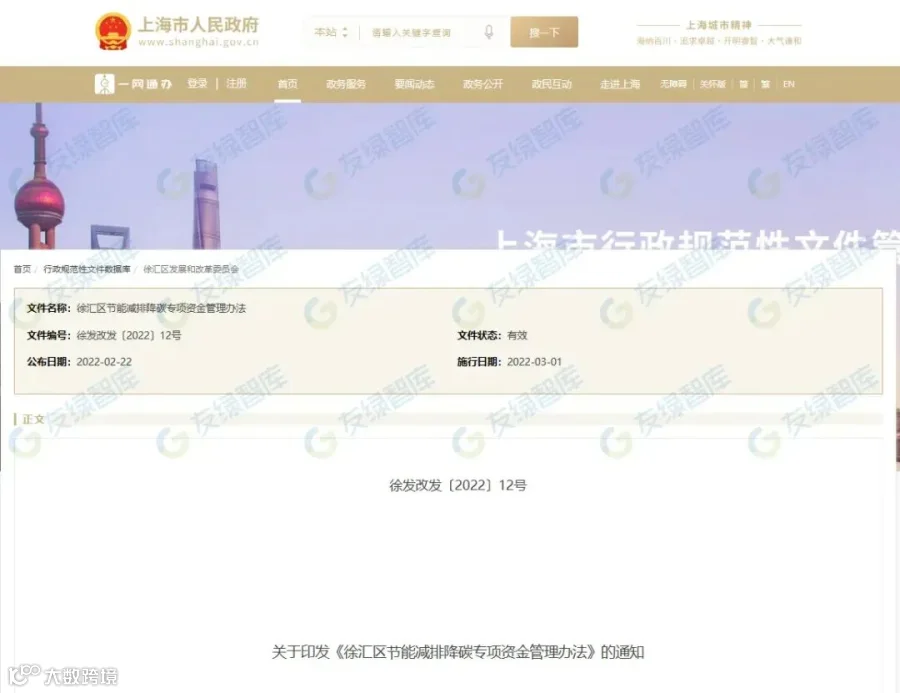政策名称:《徐汇区节能减排降碳专项资金管理办法》