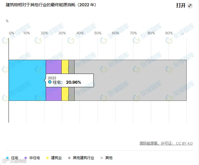 根据国际能源署数据,2022 年住宅建筑相对于其他行业的最终能源消耗为20.96%,2022年全球住宅建筑物氧化碳排放量(包括新建建筑的隐含排放量)占比达到16.58%。住宅建筑的节能减碳潜力需要引起足够重视。