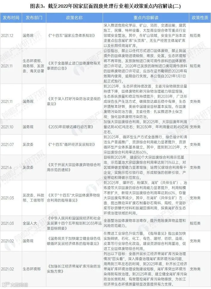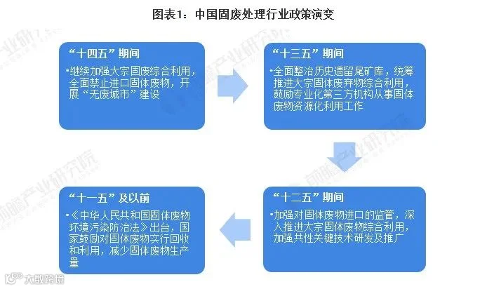 2005年,《中华人民共和国固体废物环境污染防治法》正式实施,“十一五”期间国家政策主要鼓励对固体废物实行回收和利用、减少固体废物生产量;“十二五”时期,《关于建立完整的先进的废旧商品回收体系的意见》出台,我国开始加强对固体废物进口的监管,同时深入推进大宗固体废物综合利用,加强共性关键技术研发及推广;“十三五”时期,《“无废城市”建设试点工作方案》、《工业固体废物资源综合利用评价管理暂行办法》等政策出台,提出要全面整治历史遗留尾矿库,统筹推进大宗固体废弃物综合利用,鼓励专业化第三方机构从事固体废物资源化利用相关工作;“十四五”以来,低碳化进程推进的带动下,固废处理相关国家政策进一步优化,支持力度进一步加大,全面禁止进口固体废物,继续加强大宗固废综合利用,大力开展“无废城市”建设,固废处理行业发展进入快车道。