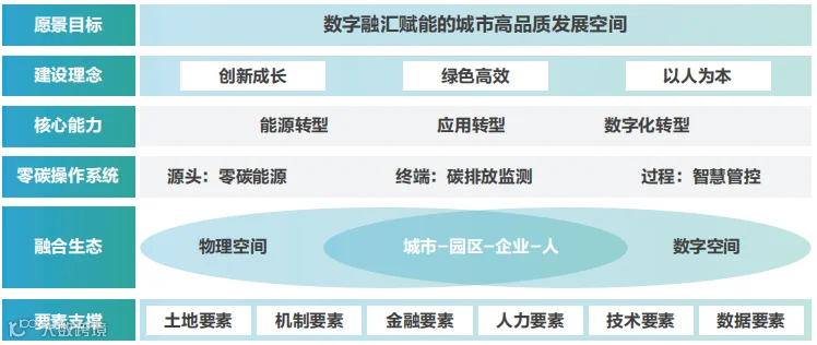 零碳智慧园区顶层设计系统融入碳中和理念,愿景目标决定了园区的理想和前进方向,强调“数字融汇赋能”,落脚点为“高品质发展”,建设理念明确园区建设的原则和要求,强调创新成长、绿色高效和以人为本,兼顾绿色与发展、兼顾生产和生态的全面规划。零碳操作系统以数据打通园区核心生产要素各环节,对园区经济社会发展以及碳排放相关重点要素数据进行系统梳理和全量汇聚,建立园区碳排放指标体系和碳管控应用,为场景化业务应用提供通用的、可复制性的基础能力支撑。依托零碳操作系统的能源转型、应用转型和数字化转型三大核心能力转型保障零碳智慧园区建设目标顺利推进和愿景落地。核心要素全面塑造园区零碳化发展环境,支撑建设目标的推进。零碳智慧园区建设上联零碳智慧城市,下接零碳产业民生,通过物理空间“城市-园区-企业-人”和数字空间的深度融合互动,实践园区的零碳化高品质发展。