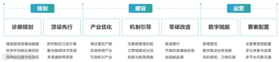 · 诊断规划:对于现有园区的零碳化改造,需要针对现有产业结构,构建碳核算模型,进行全量碳数据汇总,确定零碳目标和线路图。首先,对全园区碳排放基础数据进行全面摸底,做好碳排放数据统计和核查等基础工作,深入了解自身的碳排放情况。其次,在园区碳排放统计和核查的基础上,推进“碳达峰”测算,科学估算碳达峰目标值和达峰期限。梳理出潜在的减排途径,并对不同减排途径的减排潜力、减排成本和减排效益等进行详细评估和测算。最后,根据碳达峰目标值和测算结果,结合自身具备的能源转型、应用转型、数字化转型三大核心能力,科学选择碳中和路径,明确减排目标、重点任务、重点措施等事项,并制定详细减排时间表,形成精细化的碳排放控制计划和实施方案。