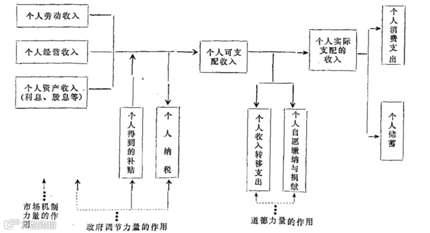 第三种力量是道德力量。它是超出市场机制与政府调节的力量之外的又一种可以影响收入分配的力量。如果说市场机制的力量主要对收入的初次分配发生作用,政府的力量既对收入的初次分配发生作用(如“事前调节”)又对收入的再分配发生作用(如“事后调节”)那么道德力量则对收入初次分配和再分配的结果发生作用,即影响已经成为个人可支配收入的收入的使用方向,包括个人间的收入转移、个人的某种自愿的缴纳和捐献等。这样,最终归个人支配和使用的收入等于个人可支配收入减去个人转移出去的收入和个人的自愿缴纳和捐献的部分。