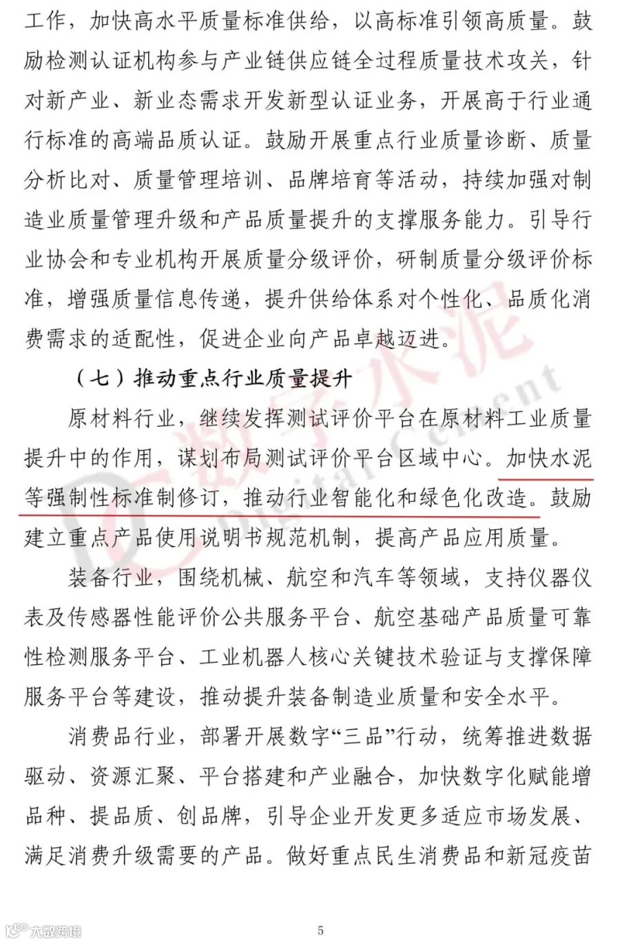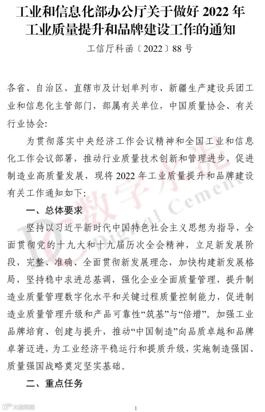 日前,工业和信息化部办公厅印发《关于做好2022年工业质量提升和品牌建设工作的通知》提到,加快水泥等强制性标准制修订,推动行业智能化和绿色化改造。通知内容如下: