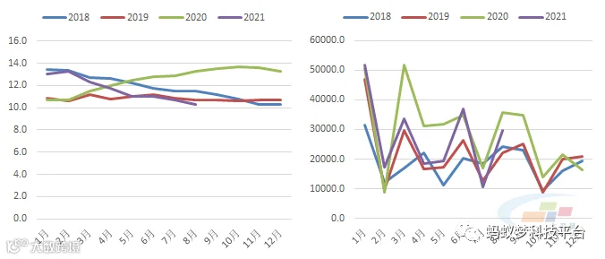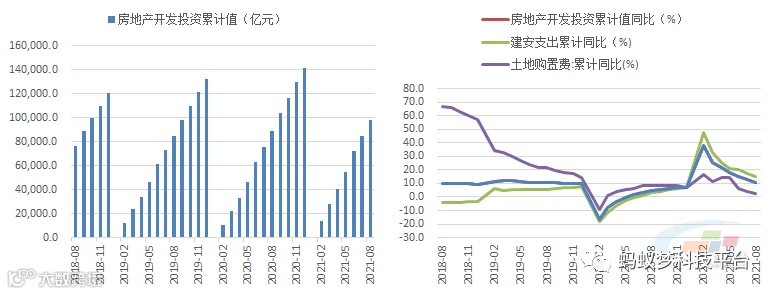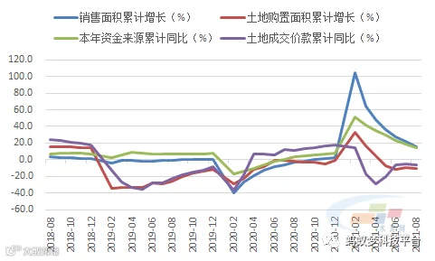 房地产投资持续放缓。2021年1-8月份,全国房地产开发投资98060亿元,同比增长10.9%,增速较1-7月回落1.8个百分点,比2019年同期提高15.9%,两年平均增长7.7%,土地购置费同比增长2.9%,较上月回落1.1个百分点。在“稳地价”政策基调下,多地延缓土地集中供应,8月份土地成交转向清冷,房企拿地热情有所消退,预计下半年房地产投资增速将延续回落态势。
