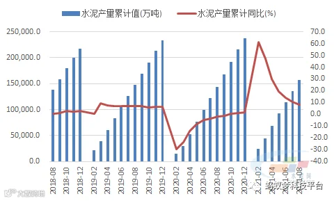根据国家统计局数据,2021年1-8月水泥产量为157325万吨,同比增长8.3%。其中7月单月水泥产量为21518万吨,同比下降5.2%,环比增长4.5%,产量较7月开始回升。