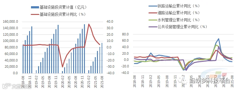 2021年1-8月份,全国固定资产投资(不含农户)约34.7万亿元,同比增长8.9%,较2019年同期下降13.4%,增速较1-7月回落1.4个百分点,两年复合增长率-6.9%。基础设施投资完成额9.4万亿,同比增长2.9% ,增速比1-7月份下降1.7个百分点,降幅收窄,其中 8月单月投资完成额12531亿元,环比增加2.3%,边际增速在改善。铁路运输业投资同比下降4.8%,降幅继续扩大;道路运输业投资同比增长2.1%,比1-7月下降2.3个百分点;水利管理业投资同比增长7.3%,增速较前值提高0.4个百分点;公共设施管理业投资同比增速0.7%,前值2.8%,增速持续放缓。