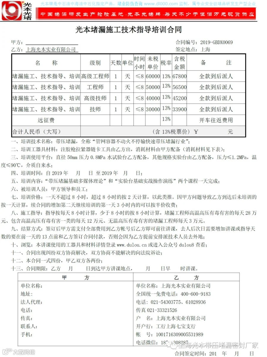 ③高空和地埋管道或容器堵漏前需要甲方搭建施工平台和地下挖掘出施工空间后乙方按照上述1、2项施工收费。